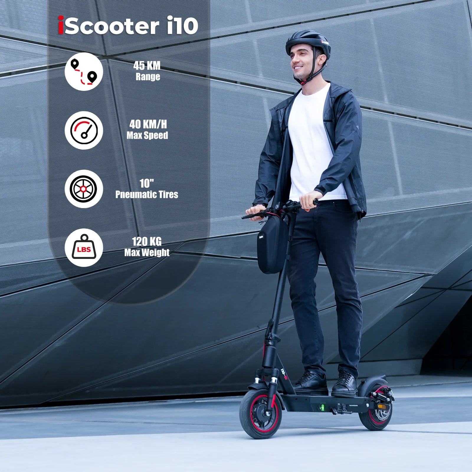 The iScooter i10 offers up to 45 km of claimed range per full charge. Actual range may vary depending on rider weight, terrain, speed mode, weather, and road conditions.