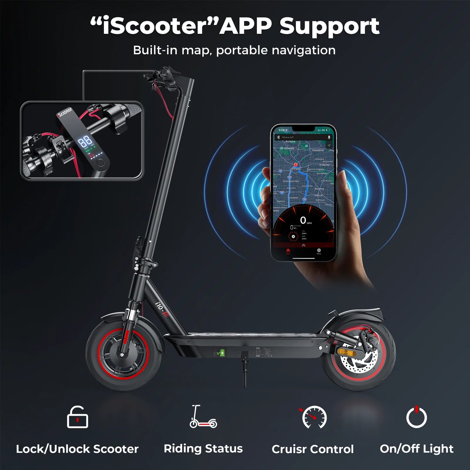 10-inch pneumatic tires for better grip and shock absorption, front and rear suspension for added stability, bright lighting, LED display, cruise control, and Smart Battery Management System with overcharge and discharge protection.