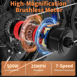 This e-bike delivers dependable power with its 500 W brushless motor, providing strong acceleration and hill-climbing ability—ideal for handling typical Canadian inclines and neighborhood ramps. The combination of fat tires and disc brakes offers confident control on wet roads or light snow, enhancing stability and ride safety.