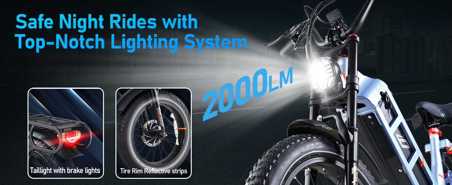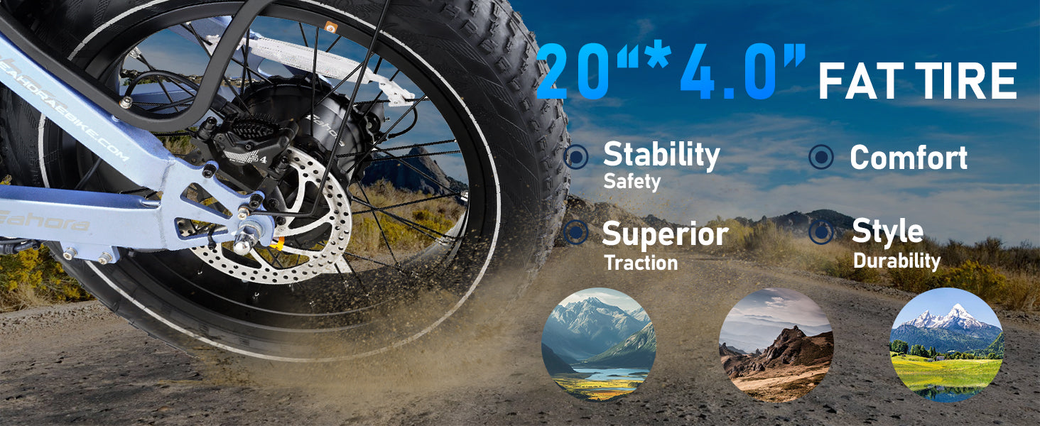 • 20" × 4.0" fat all-terrain tires and dual suspension handle snow, gravel, and rugged off-road trails with stability.