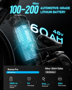 With its 60Ah, 48V battery, the Eahora Romeo Pro offers a range of 100-200 miles (160-320 km), depending on terrain and rider weight, providing excellent long-range capabilities for Canadian riders.