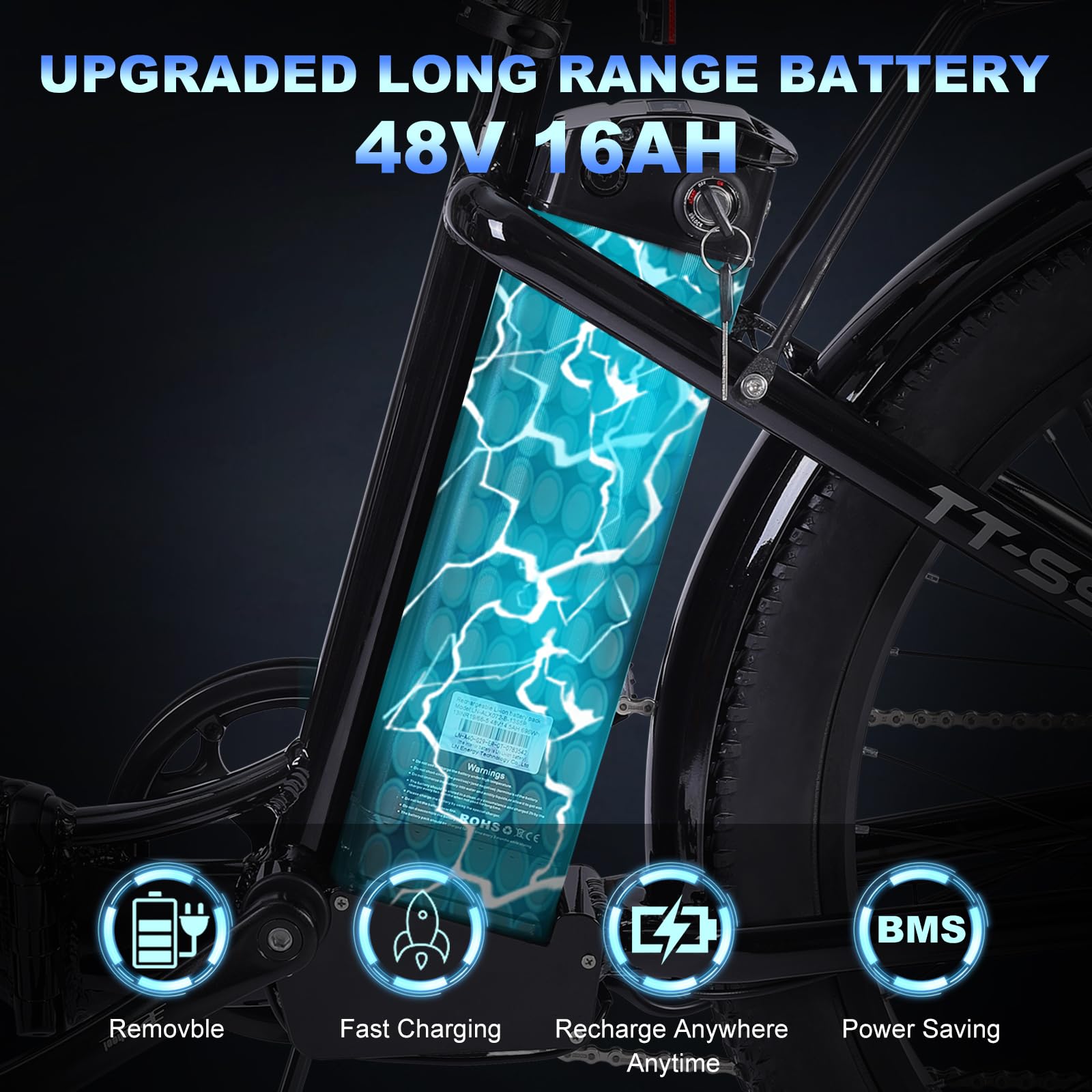 With its 48V 16Ah removable lithium battery, the TT-S9 delivers a real-world range of 40–60 km in pedal assist mode. Range may decrease in cold Canadian winters or on steep terrain.