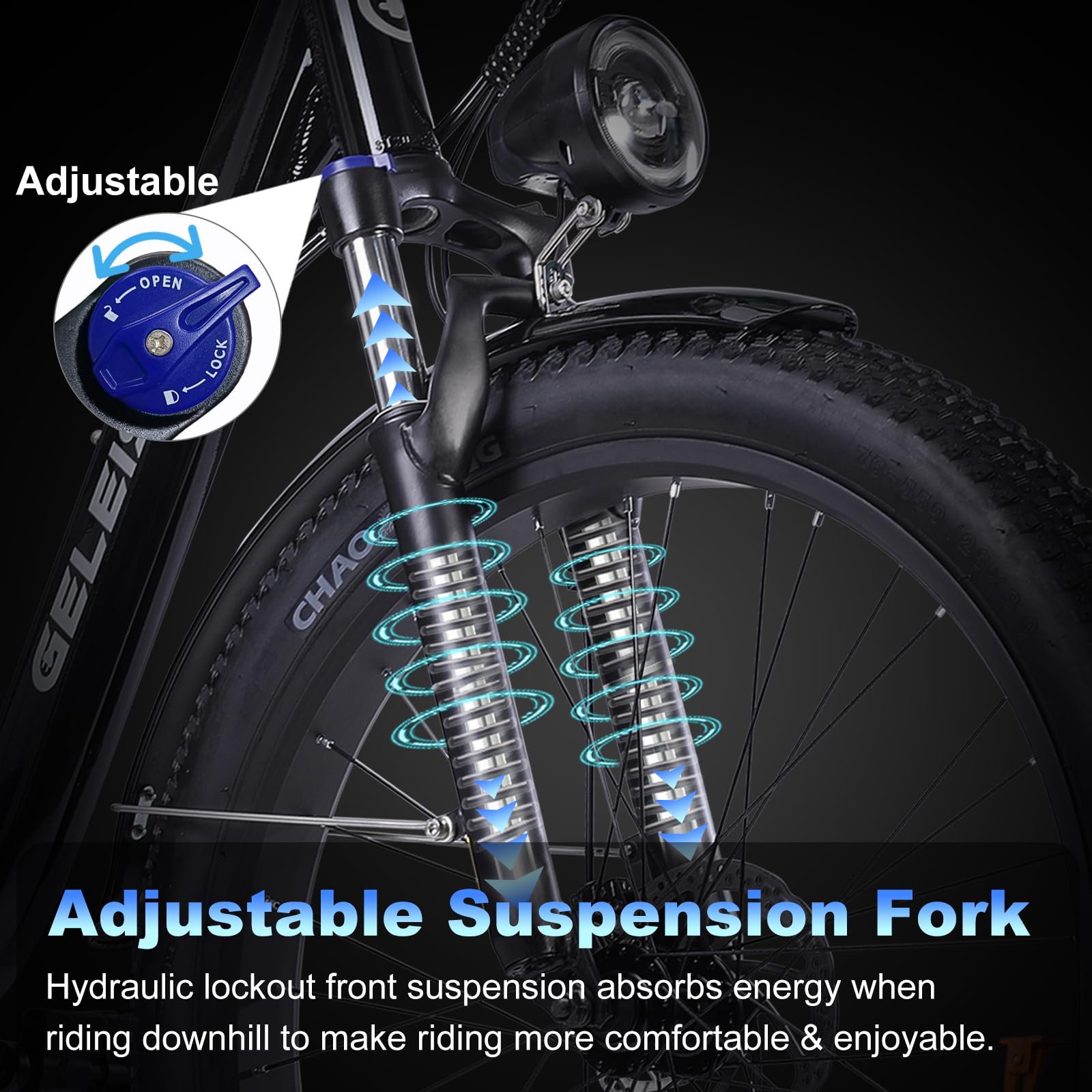 • Front suspension fork improves comfort on uneven terrain and urban potholes.