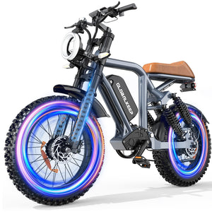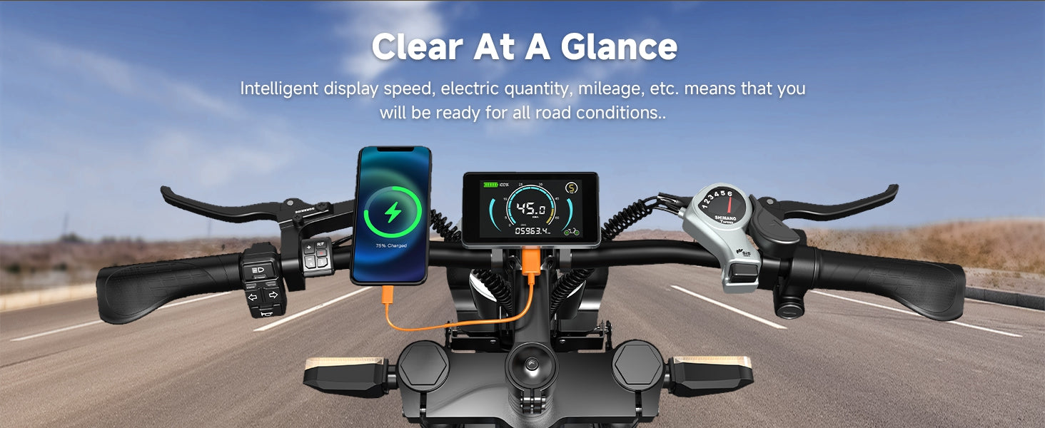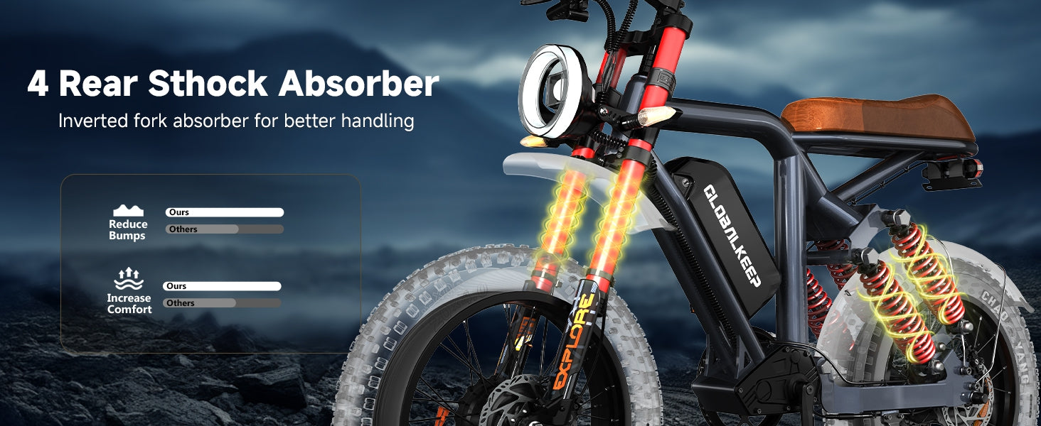 • Fat tires and suspension: stable on snow, gravel, and urban roads.