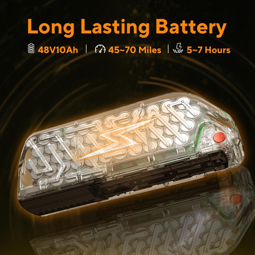 Charging the 48V 10Ah removable battery takes about 5–7 hours using the included charger. For Canadian riders, this makes overnight charging convenient and ensures a full day of commuting without range anxiety.
