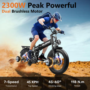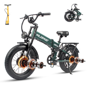 The Wildeway ORCA Folding Fat-Tire E-Bike is a versatile choice for Canadian riders who want dual-motor performance in a compact, foldable frame. With a removable 48 V 20 Ah lithium battery and 2300 W peak output, it provides the range and torque needed for both commuting and off-road adventures. Its IPX65 water resistance and hydraulic disc brakes make it suitable for wet, snowy, and mixed Canadian conditions.