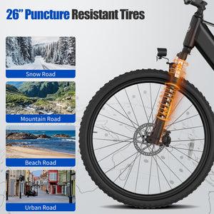 The 26″ puncture-resistant tires and dual suspension fork make this e-bike perfect for snow, mountain trails, beach roads, gravel paths, and urban streets.
